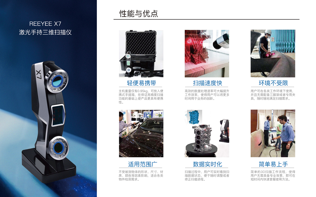 Reeyee X7全新升級,手持式激光三維掃描儀小巧便攜,操作 方便,無需外部裝夾定位,可深入狹小空間操作,掃描精度更高可達0.03mm,真正實現微米級掃描效率,掃描速率高達480000次/秒,HOI 掃描技術,HOI掃描技術能夠提高點云配準的準確性和可靠性,尤其是在掃描大型工件時效果更加卓越!