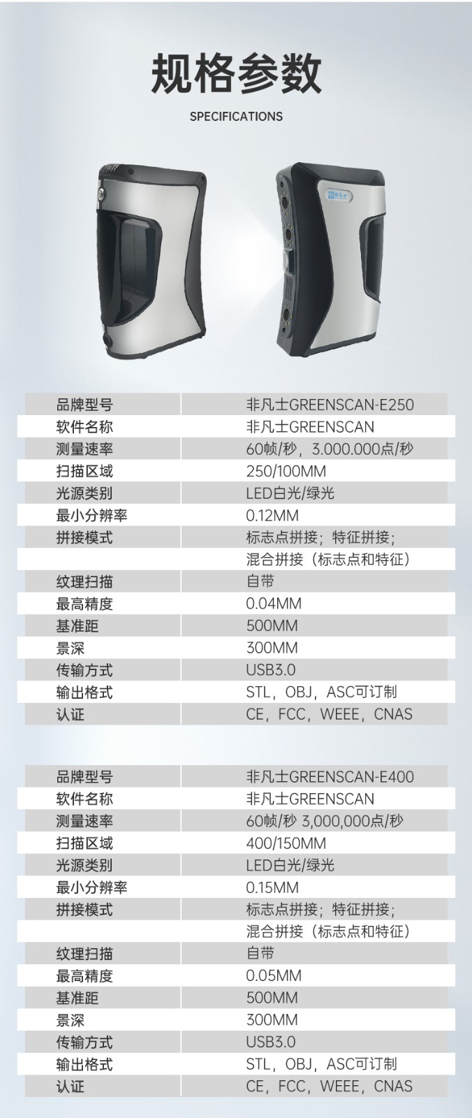 GREENScan-E系列多功能手持三維掃描儀是一款功能強大的設備,具有高速掃描和精準還原細節的特點。它的掃描速度可達60幀/秒,可在1分鐘內完成人像掃描。每秒掃描頻次可達120萬次,能夠準確還原物體的每一個細節。GREENScan-E三維掃描儀適用于多個行業,包括人像攝影、文物保護、工業制品、手板模型、手辦等。它能夠實現快速逆向建模和色彩收集等多種用途,為用戶提供了更多創造的可能性。