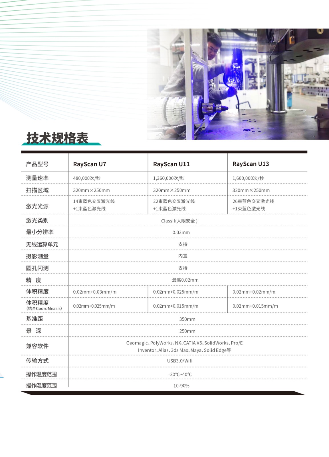 產(chǎn)品型號(hào):非凡士3D掃描儀RayScan系列包括RayScanU7、RayScanU11和RayScanU13三個(gè)型號(hào)。每個(gè)型號(hào)的測量速率和掃描區(qū)域都有所不同,用戶可以根據(jù)自己的需求選擇適合自己的型號(hào)。
