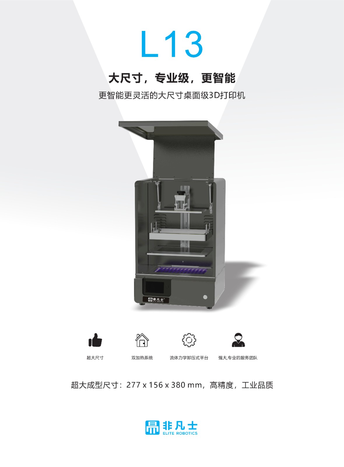 非凡士L13光固化3D打印機,采用自研陣面光源技術,確保打印精度和模型質量。工業P級高精度雙導軌設計,實現卓越穩定性和細節表現力。主動干預雙加熱系統,適應不同環境需求。支持z軸動態控制,滿足特殊打印需求。完全適配第三方樹脂,提供多樣化材料選擇。