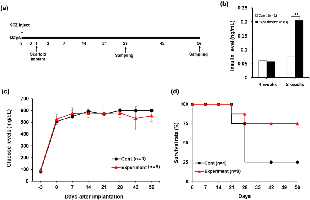 生物打印的MIN-6細胞會聚集成為直徑為100-200 μm的簇,類似于所打印結構的原始胰島。本研究采用患有I型糖尿病的小鼠模型進行體內研究,植入生物打印結構的動物在術后8周顯示出胰島素分泌水平提高三倍并可以控制血糖水平。由于植入的生物打印結構對實驗動物的胰島素分泌有積極影響,因此植入組(75%)的存活率是對照組(25%)的三倍。結果表明,本文所提出的3D生物打印的皮下結構可能是比門靜脈胰島移植的更好替代方案。