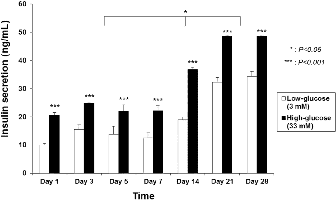 本研究論文聚焦生物3D打印胰島對I型糖尿病的治療研究。I型糖尿病是由朗格漢斯胰島β細胞缺失引起的胰島素缺乏導致的。在嚴重的情況下,一般會將胰島移植到門靜脈中。然而,由于移植胰島的喪失和胰島功能的衰竭,這些患者的5年胰島素獨立率小于50%。在這項研究中,我們開發了一種長期促進胰島素分泌的3D生物打印結構,植入皮下以防止胰島丟失。采用β細胞(小鼠胰島素瘤-6:MIN-6)包封海藻酸鹽生物墨水和聚己內酯生物降解聚合物的多層生物打印結構。葡萄糖反應測定顯示,該結構在4周的體外培養期間可以正常增殖和釋放胰島素。
