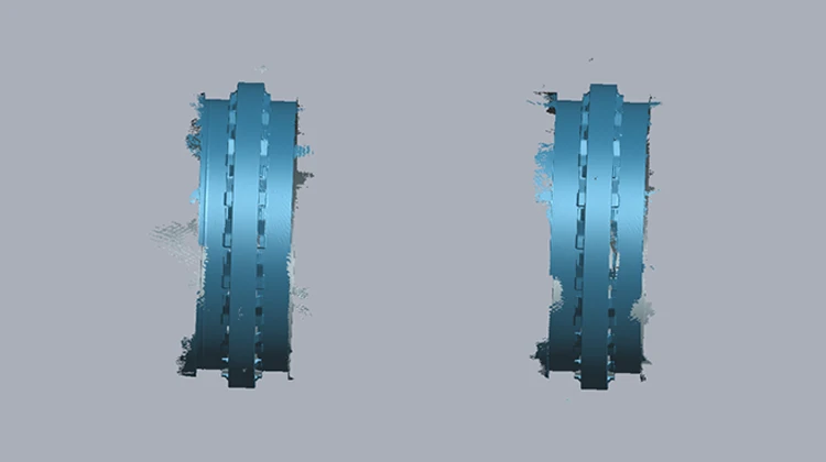 標記點采集結束后,使用HyperScan動態跟蹤模式進行掃描。現場通過人工調節電機葉輪控制工件轉速完成掃描工作。后期客戶安裝可以電動調節轉速的工裝后,測量效率還能進一步提高。