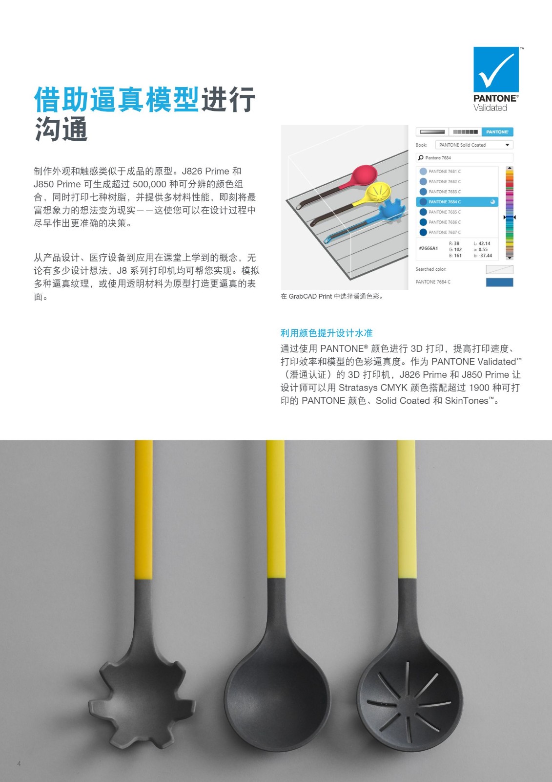 通過使用PANTONE顏色進行3D打印,提高打印速度、打印效率和模型的色彩逼真度。作為PANTONE Validated"(潘通認證)的3D打印機,J826Prime和J850Prime讓設計師可以用Stratasys CMYK顏色搭配超過1900種可打印的PANTONE顏色、Solid Coated和SkinTones"。