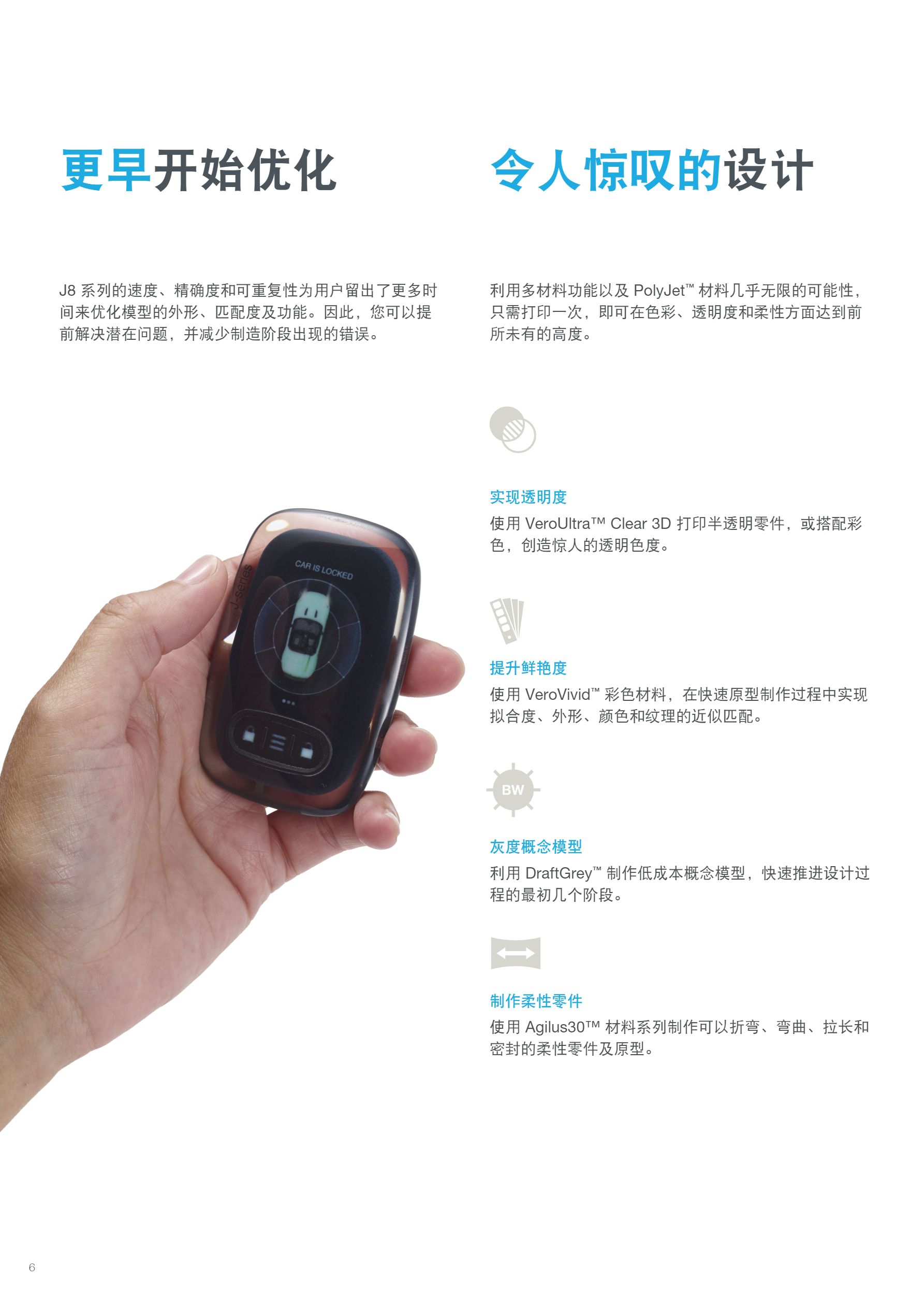制作外觀和觸感類似于成品的原型。J850 Pro J850 Prime J826 Prime 可生成超過500,000種可分辨的顏色組合,同時打印七種樹脂,并提供多材料性能,即刻將最富想象力的想法變為現實一一這使您可以在設計過程中盡早作出更準確的決策。