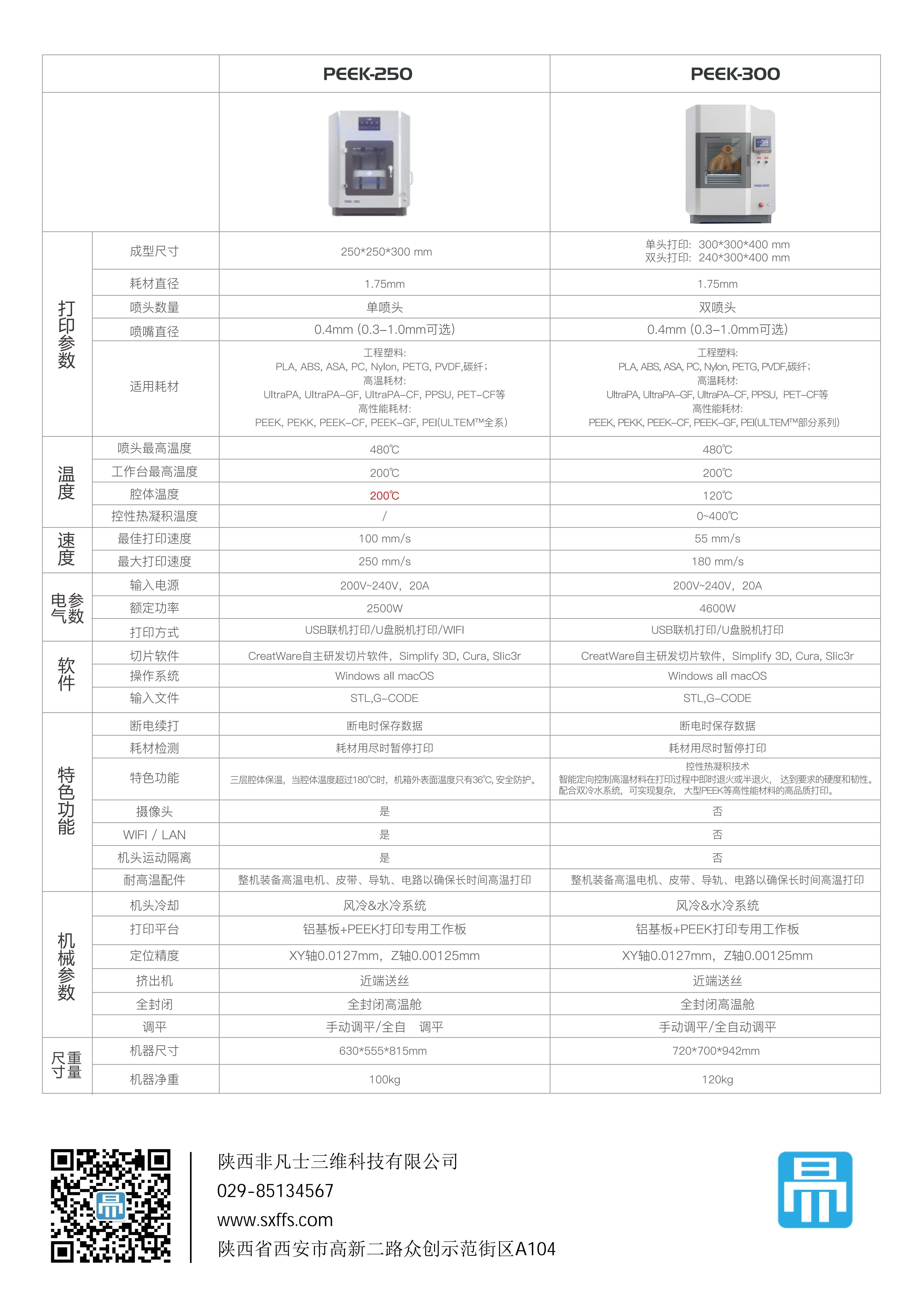 超高溫處理能力:噴頭溫度可達480°C,熱床溫度高達200°C,工作艙溫度可達200°C,這使得PEEK-250能夠處理包括PEEK、PEKK、CF-PEEK、GF-PEEK在內的高性能耗材,以及PPSU、PEI (ULTEM)、PA12、PSU、PPS等高溫耗材。