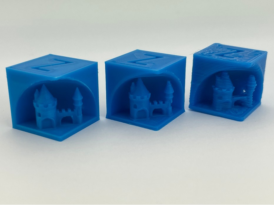 △這些3D打印的立方體展示了打印速度是如何影響零件質量的。從左到右,20毫米立方體分別用0.2毫米、0.4毫米和1.0毫米噴嘴打印;層高等于每個噴嘴孔直徑的50%。構建時間分別為分別為13分鐘、37分鐘和8分鐘。圖片來自Micro Swiss