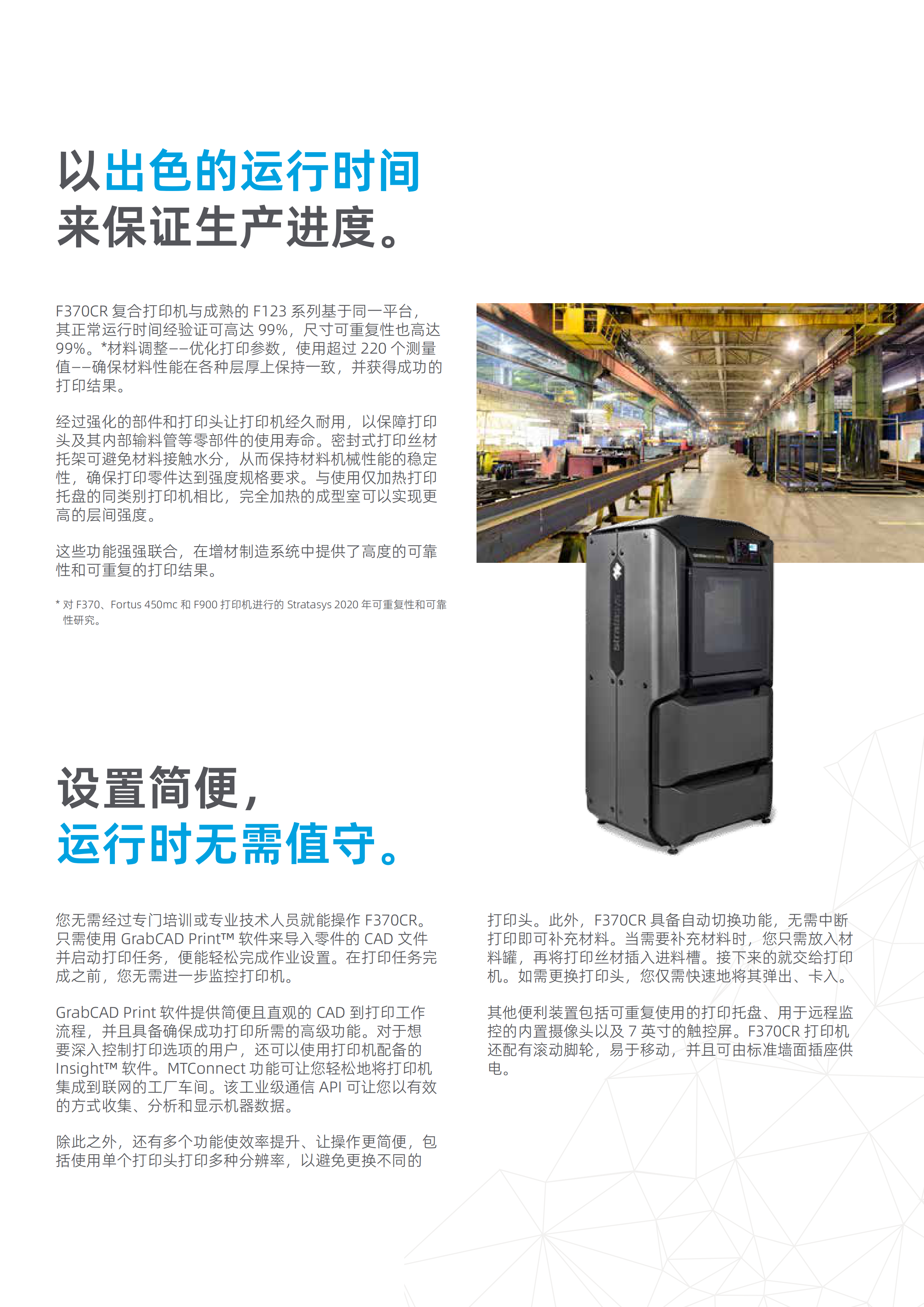 您無需經過專門培訓或專業技術人員就能操作 F370CR。只需使用 GrabCAD Print 軟件來導入零件的 CAD 文件并啟動打印任務,便能輕松完成作業設置。在打印任務完成之前,您無需進一步監控打印機。GrabCAD Print 軟件提供簡便且直觀的 CAD 到打印工作流程,并且具備高級功能。對于想要深入控制打印選項的用戶,還可以使用打印機配備的 Insight 軟件。F370CR 打印機還配有滾動腳輪,易于移動,并可由標準墻面插座供電。