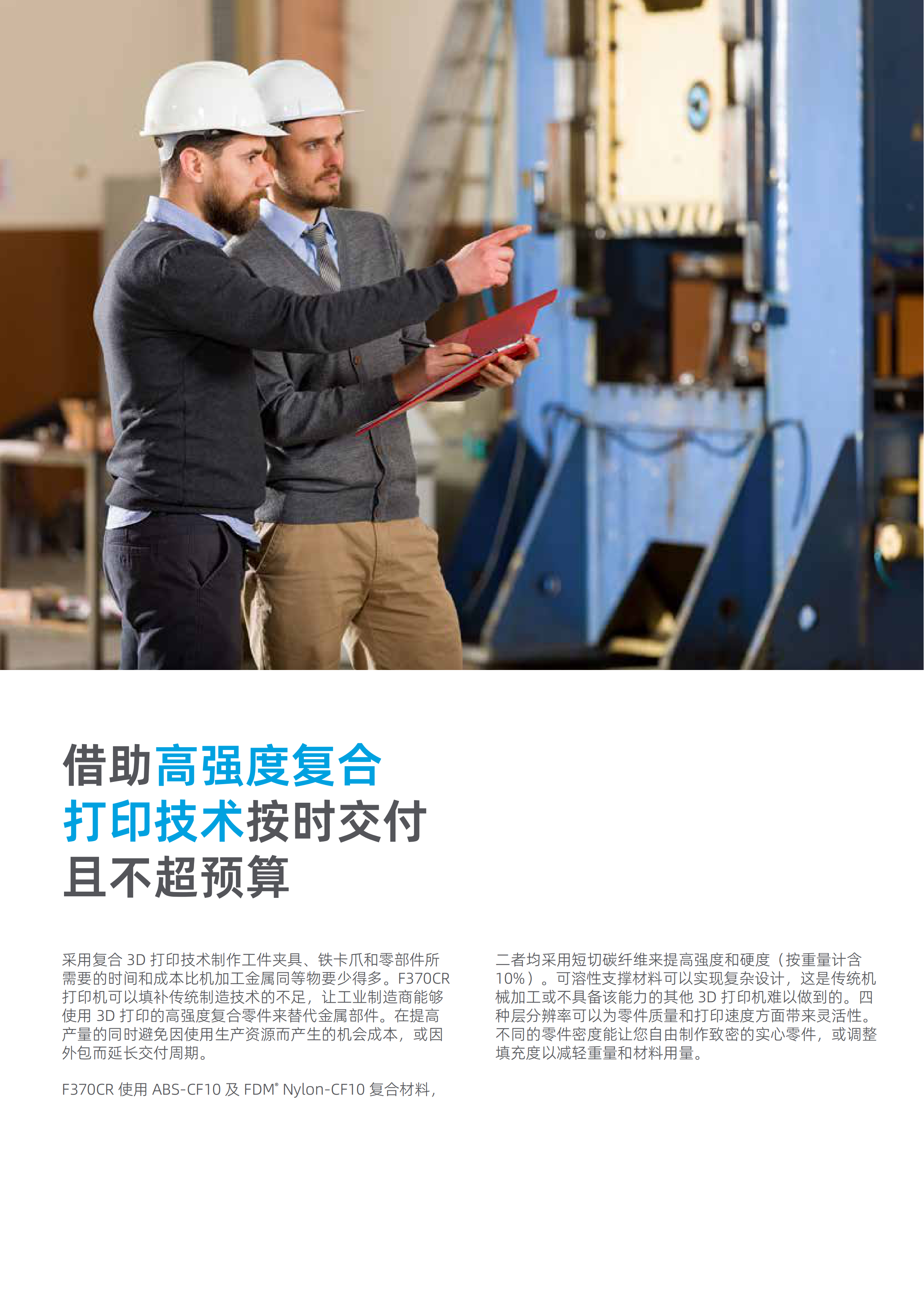 F370CR 可使用一系列熱塑材料進行打印,適用于多種應用。除了高強度復合材料,F370CR 還可以讓您靈活使用其他工程級熱塑材料進行打印,從而涵蓋更多應用。開源的材料平臺進一步增強了通用性,您可以使用自行開發的新材料或與第三方合作開發的新材料。Stratasys 開源材料生態系統包含通過基本可靠性測試的認證材料,以及在 Stratasys 材料開發過程之外制造的材料,讓您擁有更多的選擇。