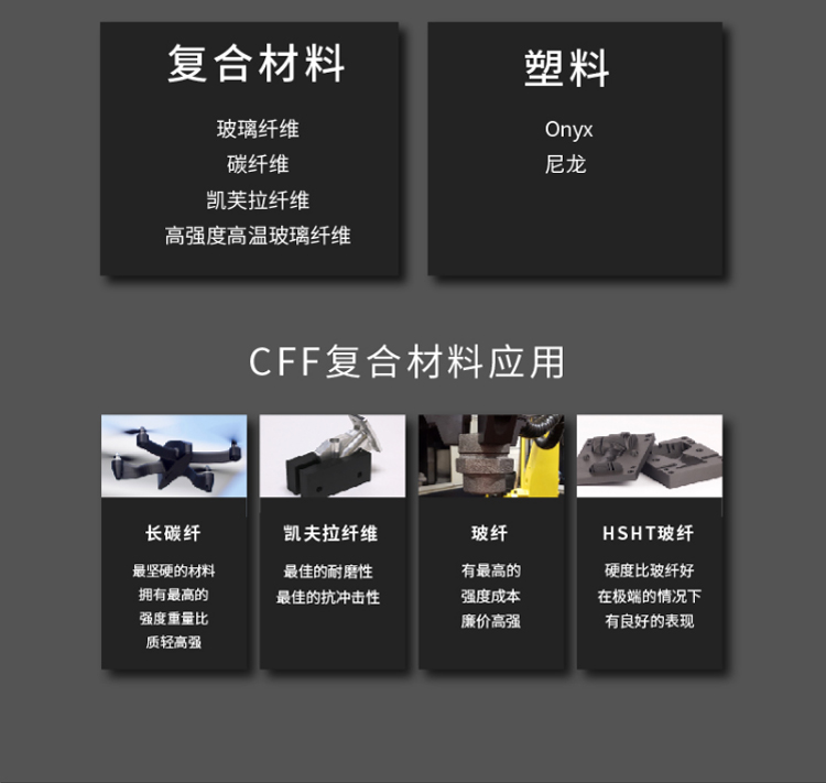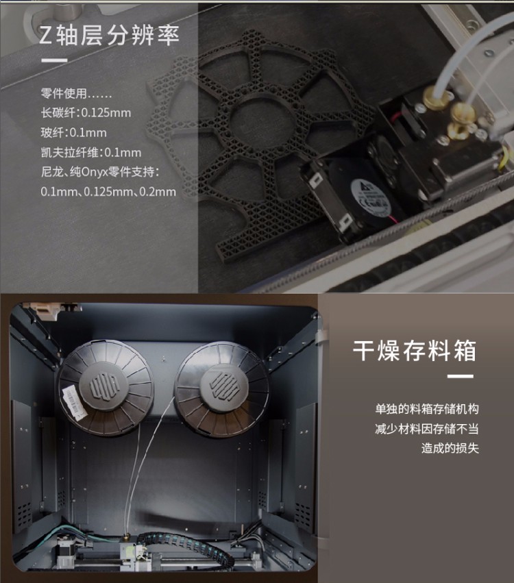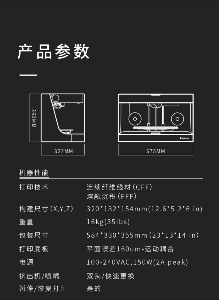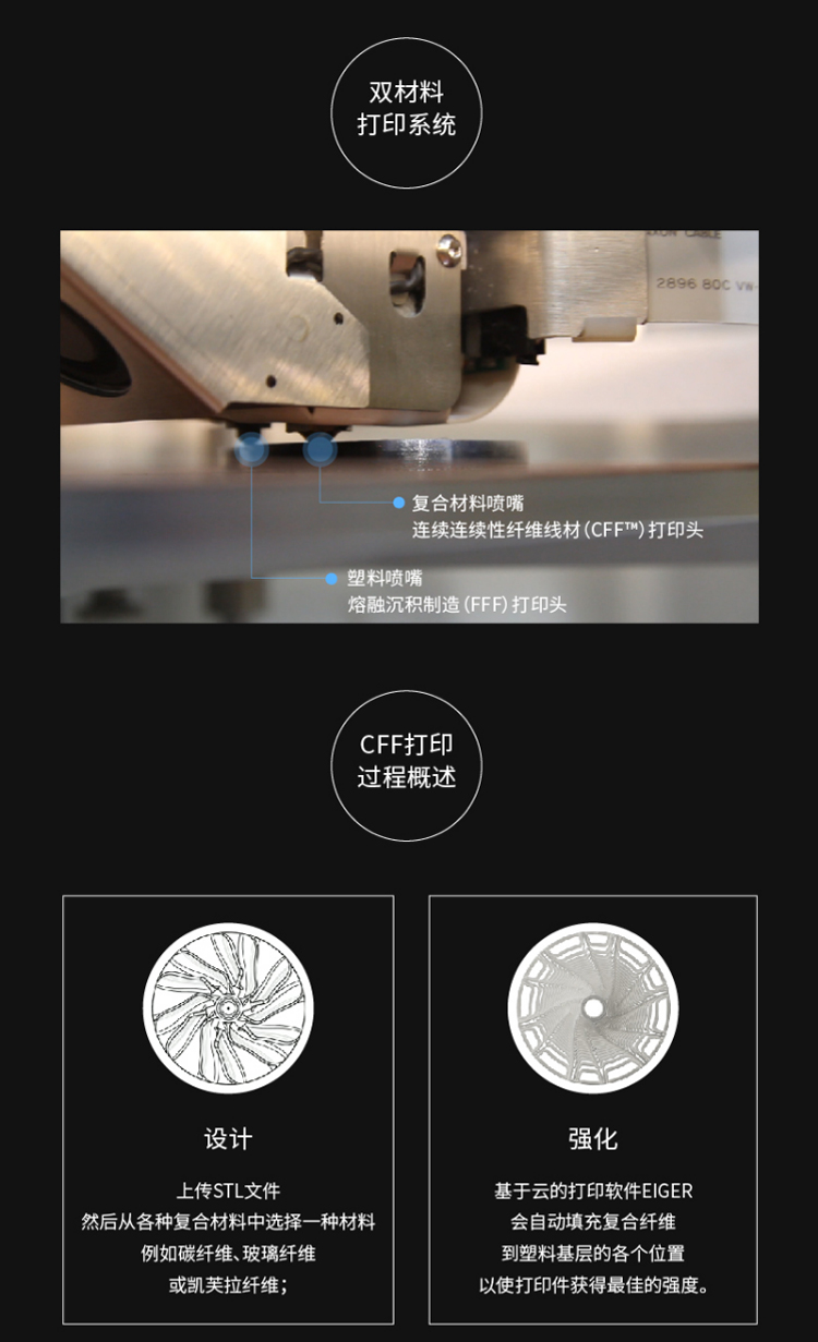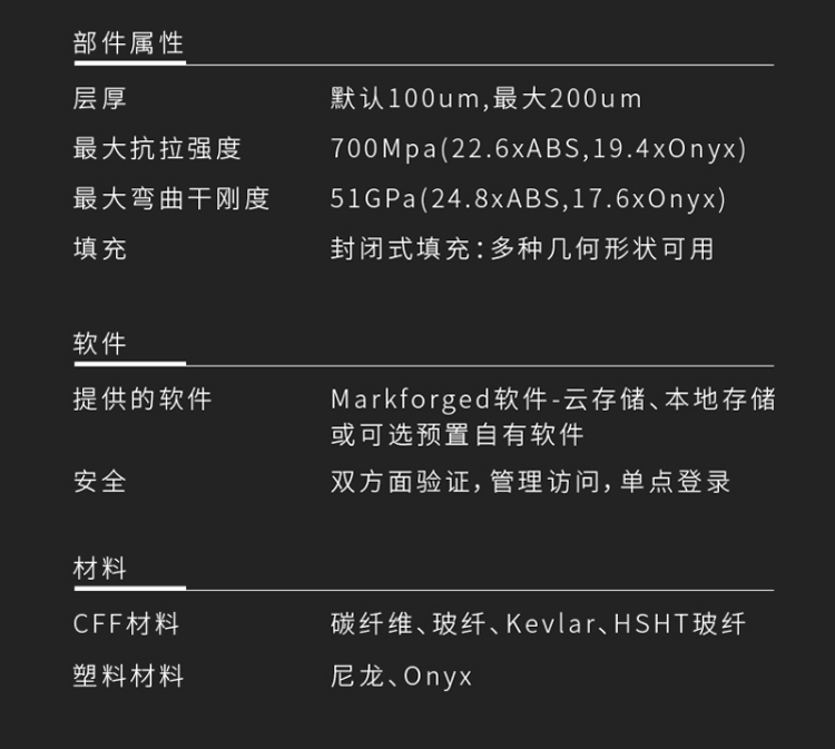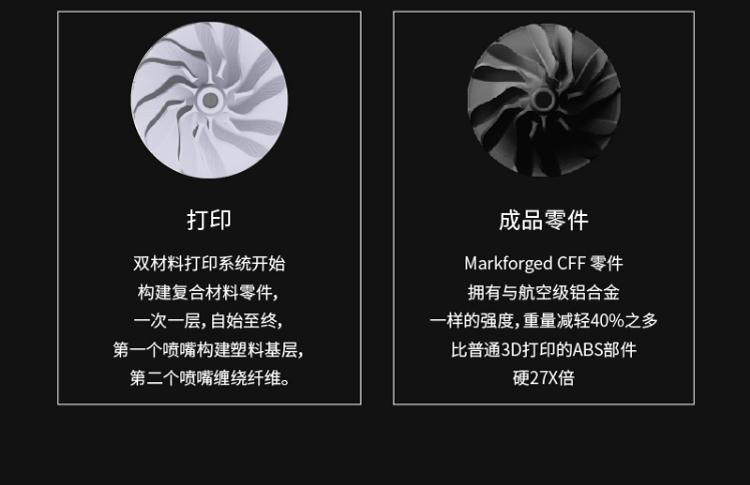 Markforged Mark Two連續碳纖維3D打印機,由美國3D打印技術公司Markforged推出。該打印機采用了Markforged自主研發的獨特技術,可以在同一設備上打印出強度高、精度高、耐熱、耐腐蝕等性能優異的零部件。Markforged Mark Two的打印材料包括了碳纖維、玻璃纖維、金屬、Kevlar等多種材料,可以滿足不同行業的需求。其支持的最大打印尺寸為320mm x 132mm x 154mm,可以打印出大型零部件,提高生產效率。還配備了自動校準和自動切換打印頭等功能,使得打印過程更加簡單和高效。此外,該打印機還支持云端管理和遠程監控,可以隨時隨地掌握打印進度和狀態。