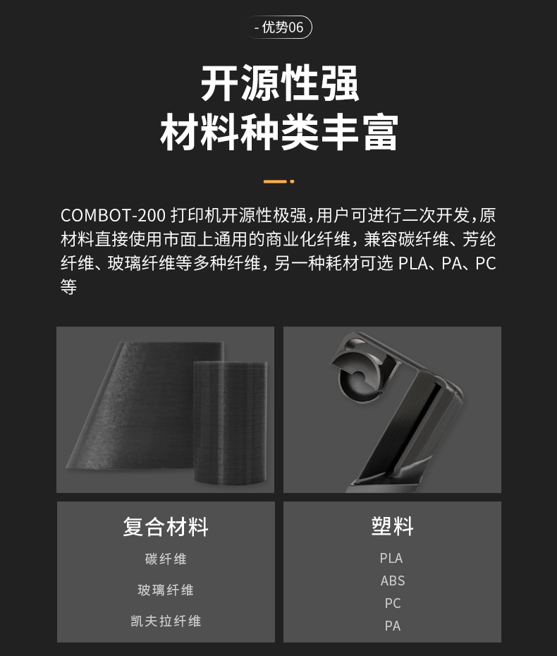Combot 200碳纖維3D打印機,具有雙材料打印系統,兼顧高強度與輕量化,構建能力強,支持個性化定制,利用連續碳纖維與PLA材料等高性能材料性能構建出高強度復合材料零件,連續打印混合材料。