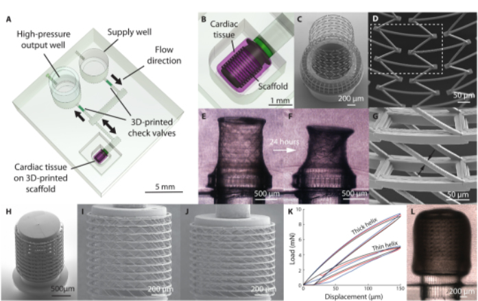 △3D打印支撐心臟組織的支架(許多部件以微米為單位,在如此精細的尺度下,通常堅硬的材料變得靈活)。圖片來自波士頓大學